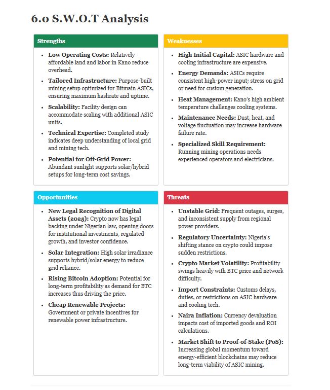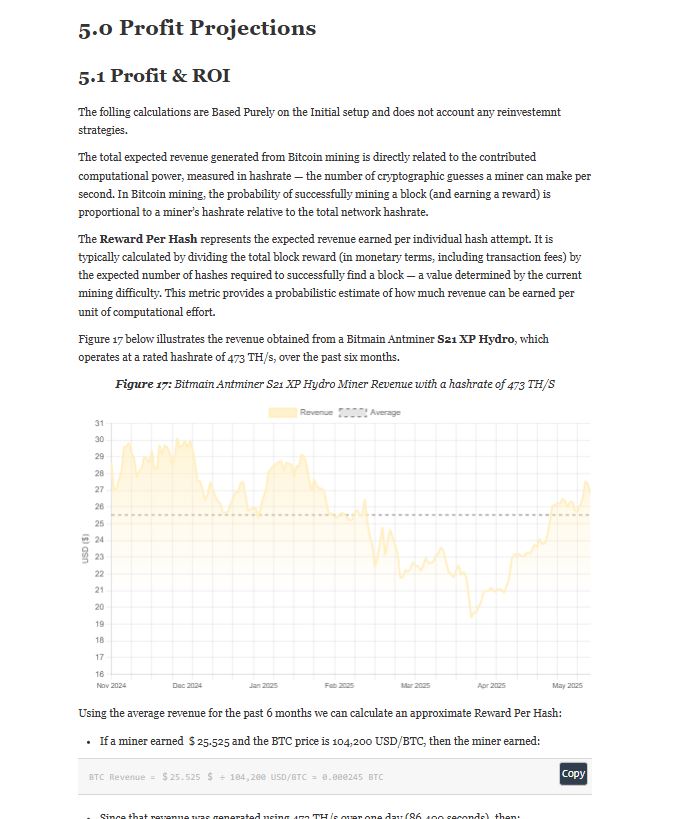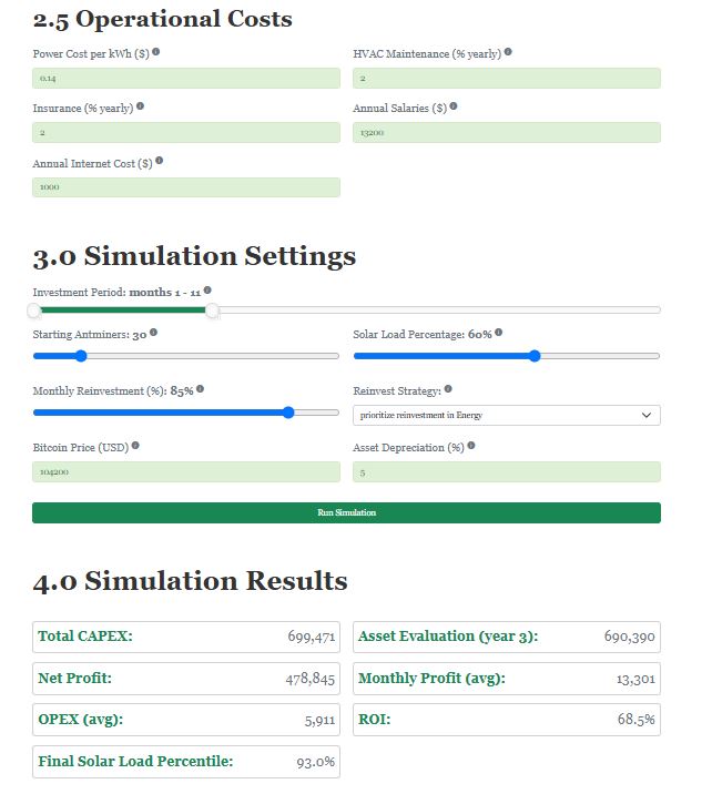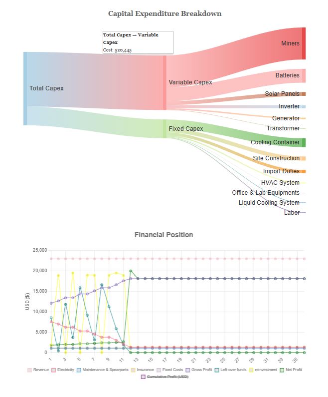 I developed and financially structured a Bitcoin mining venture based in Kano, Nigeria, leveraging Bitmain’s S21 XP Hydro ASIC miners and a custom-built energy infrastructure designed for solar-diesel hybrid integration. The project emphasizes long-term sustainability by prioritizing energy efficiency, starting with 60% solar penetration and scaling to 93% within the first 11 months. To support decision-making, I built a dedicated Python simulation script to model revenue projections, reward-per-hash calculations, reinvestment scenarios, and energy cost optimization across a 3-year horizon. This allowed for dynamic financial modeling, incorporating variables such as BTC price stability, dividend payouts, and power source shifts. The operation demonstrated a first-year profit of $145,248 and a reinvestment-driven net profit of $478,845 by year three, achieving a 68.5% ROI. The model balances high-performance mining, renewable integration, and grid resilience — forming a data-driven, scalable entry point into the digital asset economy.